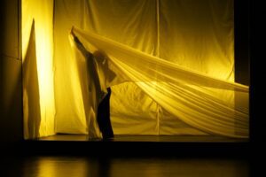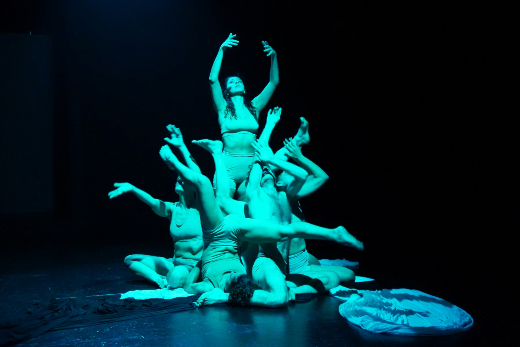 En la total oscuridad del comienzo de la obra (¡cómo cuesta que los espectadores apaguen las brillantes pantallas de sus celulares!), hay un expresivo y logrado juego de linternas manipuladas por los bailarines, mezcla de ‘luces danzantes’ y símbolo de búsqueda interior. Envueltos en cilindros de tela pendientes del techo, los intérpretes enmascaran su identidad, despojándose de su individualidad y sumándose al movimiento grupal. Los bailarines reptan como crisálidas, luchando por desprenderse de ese envoltorio, en bellas imágenes. En un permanente juego de opuestos, el vestuario está planteado en negro y blanco. Esa oposición también se traslada a lo espacial, cuando un grupo de bailarines, cabeza abajo y de frente al público, realiza con sus piernas los mismos movimientos que el otro grupo dibuja con sus brazos, sentado en el piso y de espaldas a la audiencia. Las escenas se suceden sin solución de continuidad, acompañadas por una ecléctica banda de sonido que incluye cuchicheos y risas de los propios bailarines junto a la Gnossienne Nº 1 de Erik Satie y el Aria para la cuerda de Sol de Bach, entre otras, interpretados por instrumentos de timbre oriental.