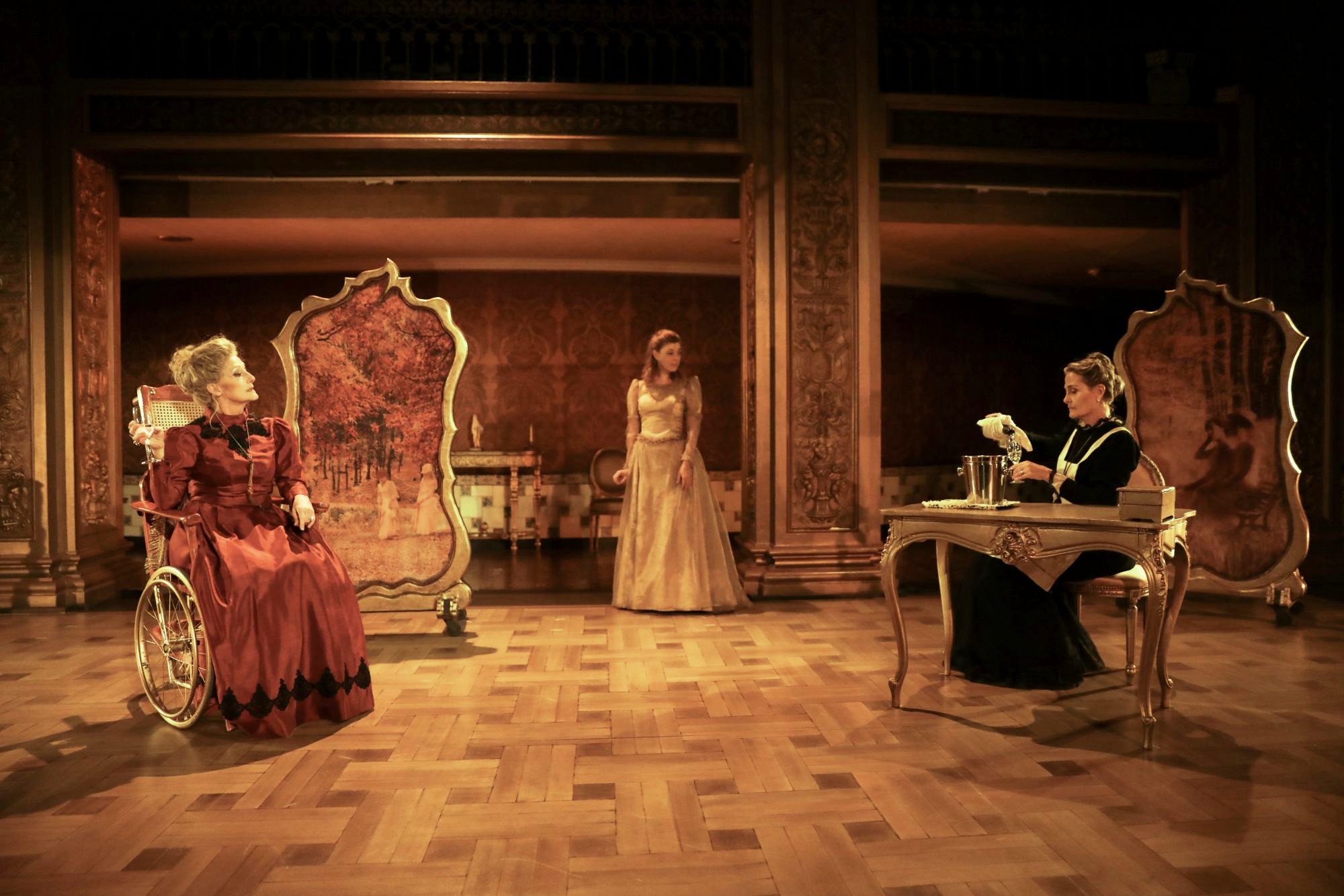 Tres mujeres —una dama de sociedad encerrada en sus delirios, su sobrina obediente y una silenciosa ama de llaves— sostienen con sus cuerpos y palabras una tensión constante entre lo que fue y lo que ya no podrá volver a ser. La puesta juega con esa fragilidad: los objetos, las luces, las sombras y la música están dispuestos con minuciosidad para sumergir al espectador en una evocación viva del pasado, donde lo bello y lo trágico respiran al unísono. La iluminación, también diseñada por Barney Finn, aporta una delicadeza notable: acentúa climas y matices con sutileza expresiva, en sintonía con la época y el tono elegíaco de la propuesta. La música de Rafael Delgado —utilizada con sensibilidad y precisión— refuerza esa atmósfera suspendida, con momentos que parecen surgir del recuerdo y se disuelven como un suspiro.