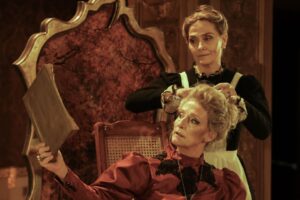 Mercedes Fraile compone una señora de alcurnia en caída libre, con modismos y gestualidad que remiten claramente —hasta con su tocado— a la Norma Desmond de Sunset Boulevard. Su presencia es imponente, y el derrumbe interior que deja entrever, conmociona. Malena Figó, como la sobrina atrapada entre el amor y el deber, aporta delicadeza y contención. Lucila Gandolfo brilla como la abnegada ama de llaves: su histrionismo es sutil, físico, preciso, y llena el aire de gestos cargados de emoción. Las tres construyen una partitura de vínculos atravesada por el sometimiento, la resistencia y el deseo callado.