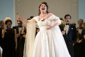 En el plano vocal, Hrachuhi Bassenz ofreció una Violetta de gran vuelo artístico: voz generosa, florituras nítidas, agudos firmes y una presencia escénica de enorme seguridad. Su Addio del passato alcanzó una hondura conmovedora, sostenida por un control técnico impecable y auténtica intensidad dramática.