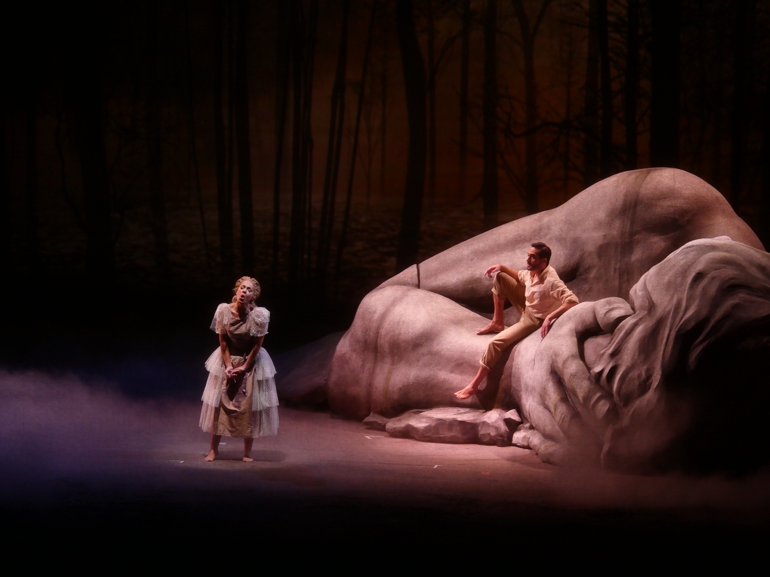 Así es durante los cambiantes actos que nos llevan a diferentes escenarios -bosques, mares, salas, fuentes, grutas, torres, pasillos, sótanos, terrazas-, todos presentados por un título, como Desde aquí veremos qué sucede en el bosque, que también dicen parte de la fábula. Verónica Cangemi corporiza a Melisande, misteriosa y reticente ante el encuentro fortuito con Golaud, quien se deja seducir por la confianza brindada. Cangemi lleva con emoción y arte la carnadura del bello e indolente personaje, es expresiva, histriónica y seduce claramente con sus agudos tan altos y a la vez tan suaves al  caballero corporizado por David Maze -en muy buen trabajo-, quien queda atónito ante su pena y se pregunta quién la habrá lastimado.