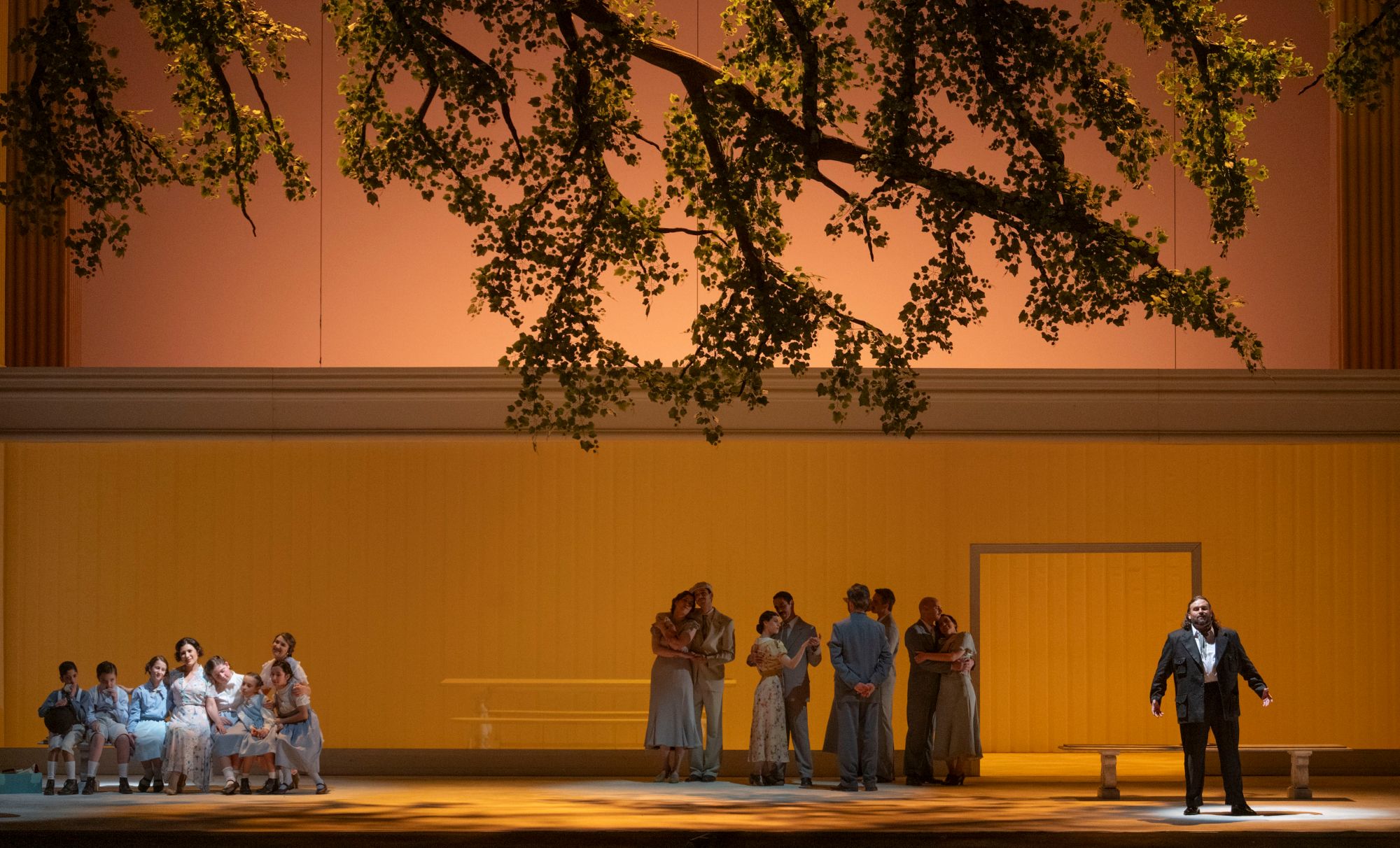 Al levantarse el telón, surge una escenografía en tonos pastel: la casa, un árbol, niños que juegan y cantan con ternura en vísperas de Navidad. La iluminación se integra con delicadeza a la propuesta visual, mutando según el devenir dramático. En ambos aspectos, Jorge Ferrari y Gonzalo Córdova lograron un trabajo de gran belleza. El paredón que transparenta el interior de la casona aporta un toque mágico, mientras los ocres diurnos y los violetas nocturnos dialogan con la música de manera fascinante.